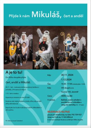 30.11 od 14:30 (Mikuláš dorazí v 15:00) čert – malovaný obličej, podobná čertíkovy z pohádky ,,Princezna ze mlejna“